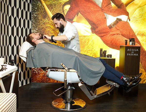 На вечеринке работала отдельная барбер-зона, где мастера концепт-пространства Barba Mosca предоставляли гостям услуги груминга и ухода за бородой с помощью средств бренда Acqua di Parma.