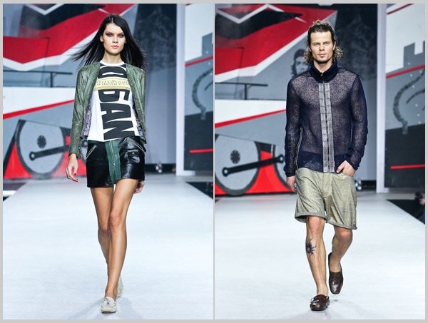 Показ Ильи Шияна как всегда прошел в формате настоящего звездного шоу. На этот раз дизайнер удивил публику необычными декорациями, созданными студентами МХПИ факультета Дизайна среды, с которым давно дружит и сотрудничает модельер. В напряженной тишине, сопровождаемый лишь стуком колес, на сцену выехал футуристической локомотив… из которого появился Дима Билан (постоянный участник показов Ильи Шияна) в сопровождении актера Владимира Сычева. «О, и ты здесь?», - обратился актер к кому-то из зала, демонстрируя обилие татуировок на обеих руках. Так начался показ новой линии дизайнера «NO БАNDИТAS».