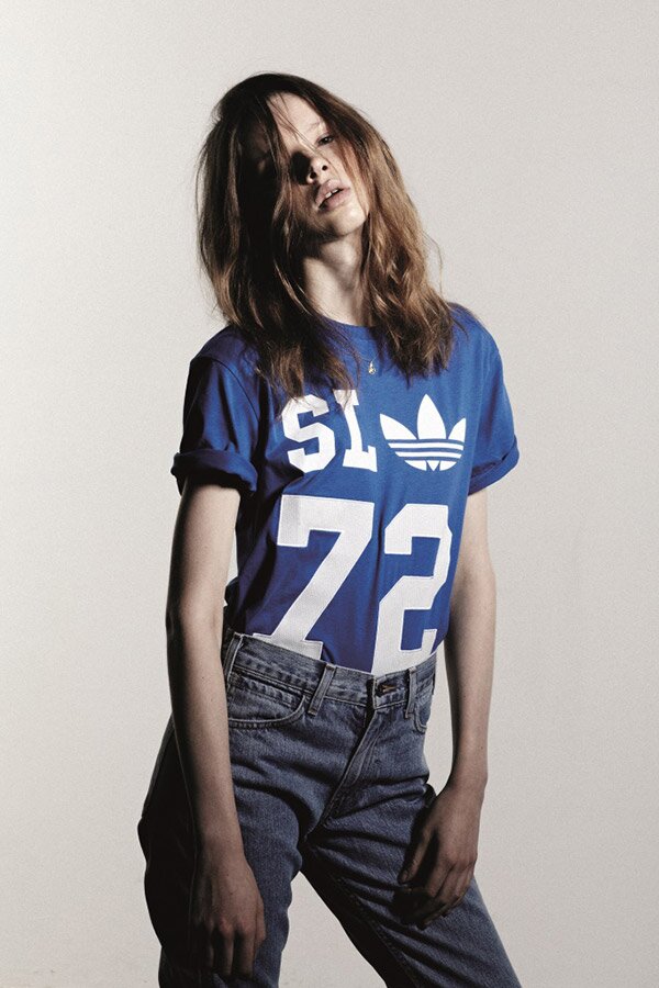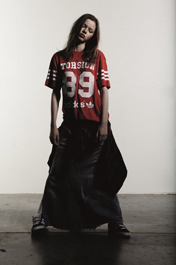 Крупные надписи TORSION89, LATRAINER84, ZX700, SL72, прославляющие культовые модели кроссовок adidas Originals, нанесены на однотонные вещи черного, белого и базовых цветов.